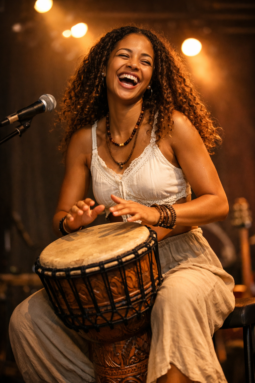 Die Djembe ist eine der bekanntesten und kraftvollsten afrikanischen Trommeln und wird seit Jahrhunderten in Westafrika gespielt. Sie gilt als Herzstück vieler Rituale, Tänze und gemeinschaftlicher Musikformen – getragen von Rhythmus, Körper und Stimme.